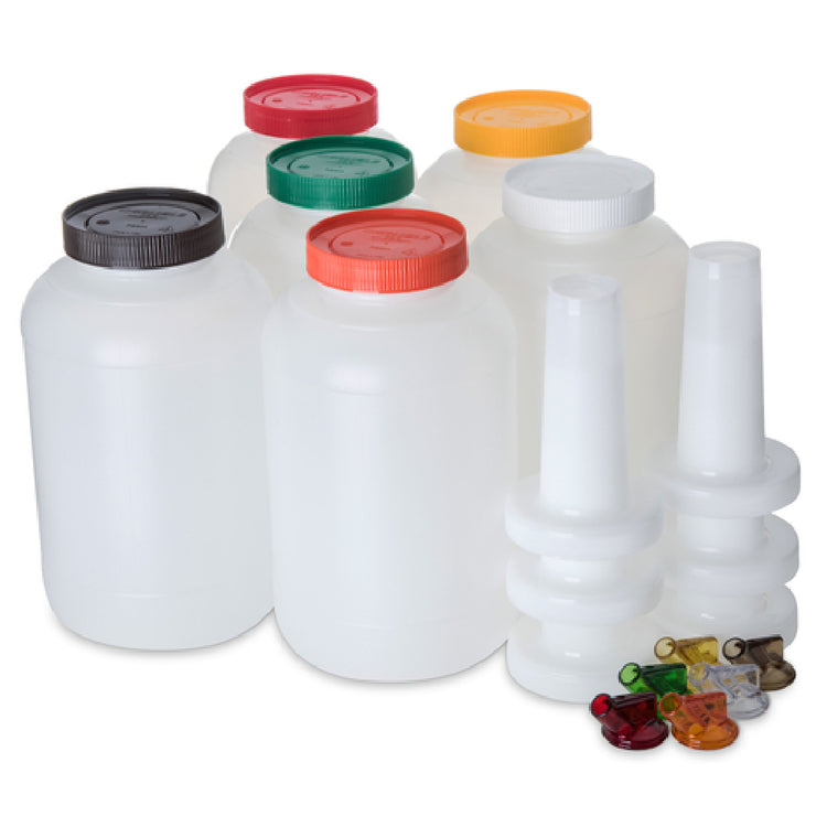 The Carlisle PS801B00 Carlisle Store 'N Pour® Gallon Complete 128 Oz. Container is a highly practical solution for various industry segments requiring efficient liquid storage and dispensing. This product features a robust 128-ounce capacity, making it suitable for both commercial and domestic use where large volumes are managed. Constructed from break-resistant polyethylene, it ensures durability and longevity, even in demanding environments. The container's design incorporates a neck and a color-coordinated spout and cap system, which aids in easy identification and prevents cross-contamination, a critical factor in food service and hospitality industries. The color options include clear, yellow, brown, orange, red, and green, offering a versatile choice to match specific operational needs or aesthetic preferences. Being dishwasher safe, the Store 'N Pour® simplifies cleaning processes, enhancing operational efficiency. Moreover, the polyethylene material is BPA-free, ensuring safety and compliance with health standards. Each case includes one of each color, packed six per case, allowing for organized storage and distribution. This container is ideally suited for bars, restaurants, and catering services that require reliable and safe storage solutions. Its thoughtful design and sturdy construction make it a valuable tool for managing liquid ingredients with ease and precision.