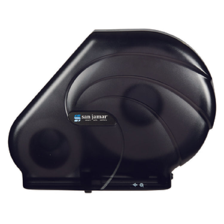 The Carlisle R3090TBK San Jamar Oceans® Reserva® Bath Tissue Dispenser is a meticulously designed solution for efficient tissue dispensing in various commercial environments. Measuring 16-3/4"W x 5-1/2"D x 12-1/4"H, this dispenser is crafted to hold either one 9" to 10-1/2" jumbo roll or two 5" stub rolls, accommodating different tissue requirements seamlessly. Its construction from break-resistant plastic ensures longevity and durability, making it suitable for high-traffic restrooms. A see-thru gauge is integrated into the design, allowing for easy monitoring of tissue levels, enhancing operational efficiency. The full swing replaceable cover and lock offer security and ease of maintenance, while the translucent black pearl finish adds a touch of elegance to restroom decor. The practical features of the Carlisle R3090TBK make it a versatile choice, appealing to facility managers in sectors such as hospitality, healthcare, and education, where reliability and aesthetic value are paramount. With its robust design and user-friendly features, this bath tissue dispenser provides a practical and stylish solution for maintaining hygiene and convenience in public and private restrooms alike.