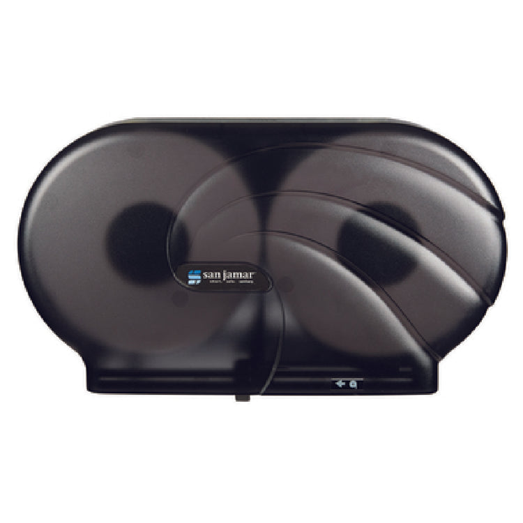 The Carlisle R4090TBK San Jamar Oceans® Bath Tissue Dispenser is a meticulously designed accessory for commercial restrooms, engineered to fit two 9-inch jumbo rolls. With dimensions of 19 inches in width, 5-1/4 inches in depth, and 12 inches in height, this dispenser is compact yet spacious, catering to high-traffic areas that require frequent refills. Crafted from break and chemical-resistant plastic, this dispenser promises durability and longevity, making it a wise investment for facilities looking to minimize maintenance and replacement costs. Its full swing replaceable cover ensures easy access for restocking, while the sliding panel allows for efficient use of the rolls. The translucent black pearl finish not only adds a touch of elegance but also features a see-thru gauge that allows staff to monitor the tissue levels at a glance, ensuring timely replacements. This product is ideal for environments such as commercial offices, restaurants, and public restrooms, where both functionality and style are paramount. The Carlisle R4090TBK San Jamar Oceans® Bath Tissue Dispenser combines robust functionality with sleek design, meeting the diverse needs of hospitality, healthcare, and corporate industries effectively.