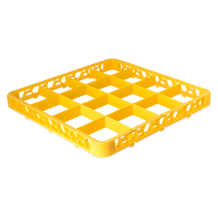 The Carlisle RE16C04 Carlisle OptiClean™ Divided Glass Rack Extender Full-size is a premium, full-size extender designed for optimal glassware protection and organization. It features 16 compartments, each measuring 4-7/16 inches by 4-7/16 inches, providing ample space for various glass sizes, essential for establishments that prioritize order and efficiency. The product is color-coded for easy identification and inventory management, facilitating quick access and organization within commercial kitchens, bars, and catering services. The positive stacking design ensures stability and security during storage and transport, reducing breakage risks. Additionally, this extender employs a four-way tracking system, allowing for seamless integration into existing warewashing processes. Constructed with double-wall reinforced polypropylene, it promises durability and resilience, handling the rigorous demands of daily use in busy environments. The textured finish not only enhances grip but also adds a layer of sophistication to its appearance. Available in a vibrant yellow, the rack extender is easily noticeable, reducing the chance of misplacement. This product is indispensable for businesses seeking reliability and long-lasting performance in their glassware maintenance systems.