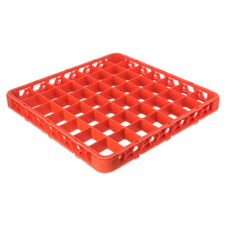 The Carlisle RE49C24 Carlisle OptiClean™ Divided Glass Rack Extender Full-size is engineered for optimal glassware organization and protection in commercial settings. Featuring 49 compartments each measuring 2-3/8" by 2-3/8", this rack extender is meticulously designed to accommodate a wide variety of glass styles, ensuring secure separation and minimizing breakage during washing and transport. Its color-coded design facilitates easy identification and sorting, enhancing operational efficiency in fast-paced environments. The positive stacking feature, along with four-way tracking, ensures stability and ease of movement, optimizing space and storage solutions. Constructed from double-wall reinforced polypropylene, this extender offers robust durability and long-term performance, ideal for high-volume usage in hospitality industries. The textured finish provides a non-slip grip, reducing the risk of accidents and promoting safety. Available in a vibrant orange color, it not only enhances visual appeal but also aids in quick identification among other equipment. The Carlisle RE49C24 is a versatile addition for restaurants, hotels, and catering services, offering a reliable and structured solution for glassware maintenance and transportation, tailored to meet the rigorous demands of professional foodservice environments.
