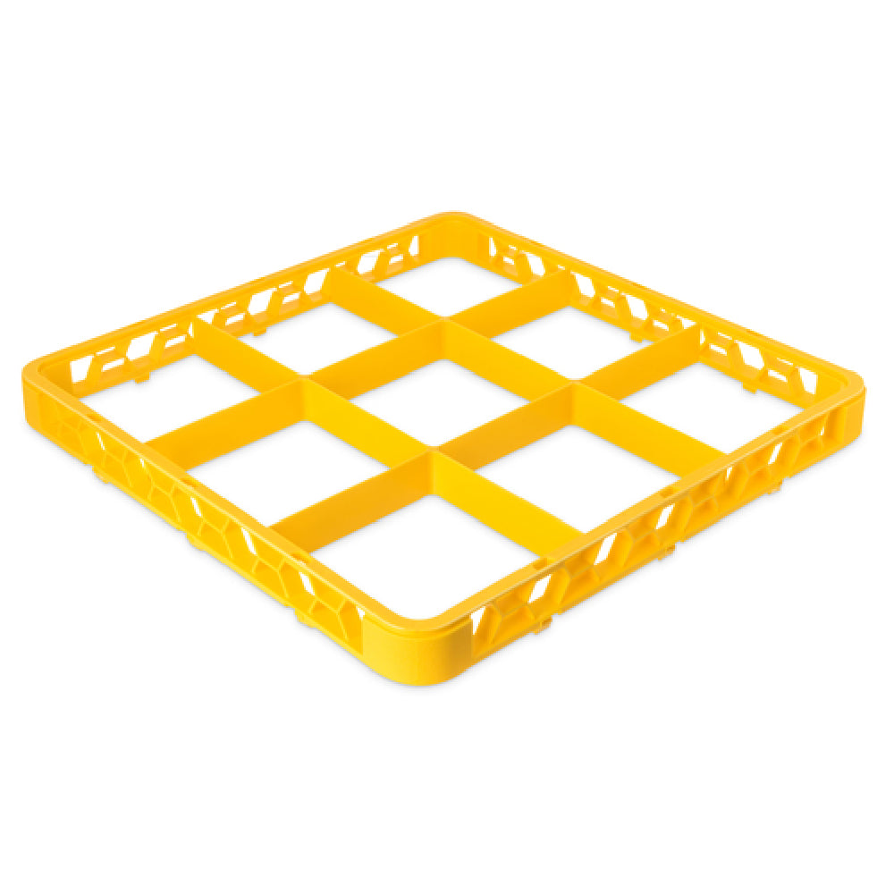 The Carlisle RE9C04 Carlisle OptiClean™ Divided Glass Rack Extender Full-size is a meticulously designed solution for optimizing glassware storage and transport in commercial settings. Featuring nine compartments, each measuring 5-13/16" x 5-13/16", this rack extender ensures each glass is securely held, minimizing the risk of breakage. The color-coded design facilitates easy identification and sorting in a bustling kitchen environment. Its positive stacking and four-way tracking capabilities streamline storage and handling, maximizing space efficiency and operational flow. Constructed from double-wall reinforced polypropylene, the extender boasts durability and resilience, ideal for withstanding the rigors of frequent use. The textured finish not only adds a layer of sophistication but also provides a non-slip surface, enhancing grip for safer handling. Available in a vibrant yellow color, it stands out for easy identification and retrieval. The Carlisle RE9C04 is an invaluable asset for catering companies, restaurants, and bars, providing a robust, reliable solution for maintaining glassware integrity and organization. Its thoughtful engineering supports the demands of high-volume establishments, ensuring that glassware is kept in pristine condition, ready for service. This extender is a testament to Carlisle's commitment to quality and innovation in the foodservice industry.