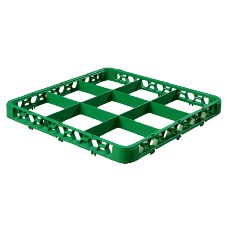 The Carlisle RE9C09 Carlisle OptiClean™ Divided Glass Rack Extender Full-size is engineered to optimize the organization and safety of glassware in commercial settings. Featuring nine compartments, each measuring 5-13/16" x 5-13/16", this rack extender is designed to accommodate a variety of glass sizes while ensuring protection during storage and transport. Its color-coded system facilitates easy identification and sorting, enhancing efficiency in fast-paced environments such as restaurants and bars. The positive stacking feature provides stability and secure stacking, minimizing the risk of accidents. Built with a robust double-wall reinforced polypropylene construction, the extender exhibits exceptional durability and resilience, even under heavy use. The textured finish not only adds an aesthetic touch but also improves grip, reducing the likelihood of slippage. This full-size glass rack extender is designed with four-way tracking, allowing for seamless integration with existing systems and ensuring smooth operations. The green color coding enhances visual organization, aiding in quick access and inventory management. Ideal for the hospitality industry, the Carlisle RE9C09 provides a reliable solution for glassware management, combining functionality with durability to meet the diverse needs of various market segments within the food and beverage industry.