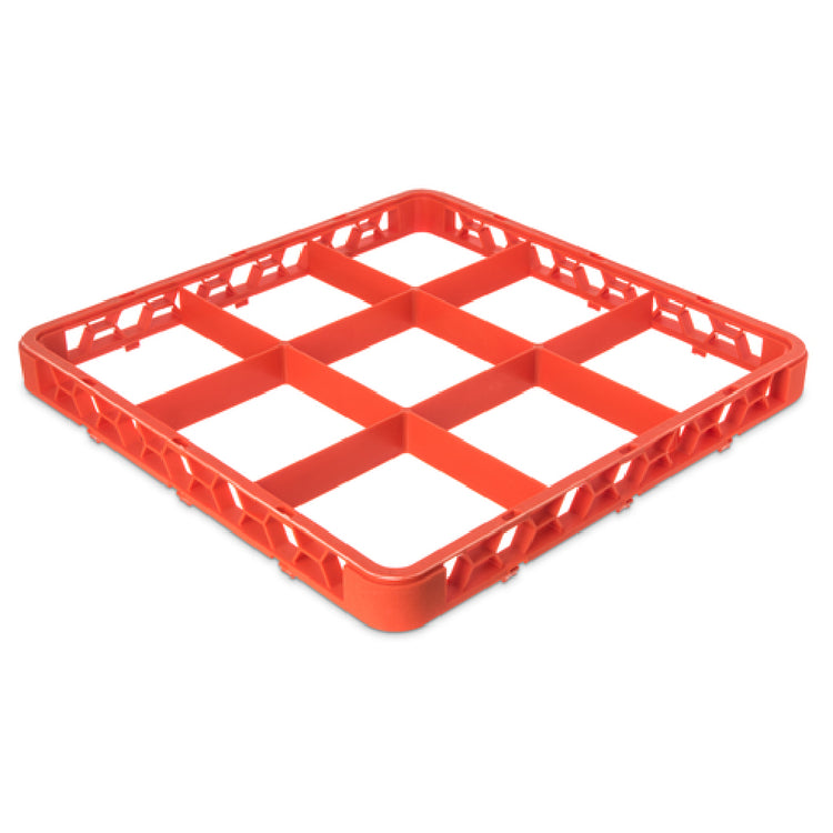 The Carlisle RE9C24 Carlisle OptiClean™ Divided Glass Rack Extender Full-size is a robust addition to any dishwashing operation, designed to enhance the efficiency and organization of glassware storage. Specifically engineered with 9-compartments, each compartment measures 5-13/16" x 5-13/16", providing ample space for various glass sizes while ensuring optimal protection and cleanliness. The product's color-coded system facilitates easy identification and integration with existing dishware management systems, minimizing operational disruptions. Featuring positive stacking and four-way tracking capabilities, this glass rack extender allows for streamlined stacking and seamless maneuverability within busy kitchen environments. Constructed from double-wall reinforced polypropylene, it ensures durability and longevity under frequent use, supported by a textured finish that aids in grip and handling. The vibrant orange hue of the extender not only adds a splash of color to kitchen operations but also aids in quick visual identification. This product is an indispensable tool for restaurants, hotels, and catering services, seeking to maintain high standards of glassware presentation and hygiene. By integrating the Carlisle RE9C24 Carlisle OptiClean™ Divided Glass Rack Extender into their operations, businesses can achieve enhanced efficiency, reduced breakages, and improved overall service quality.