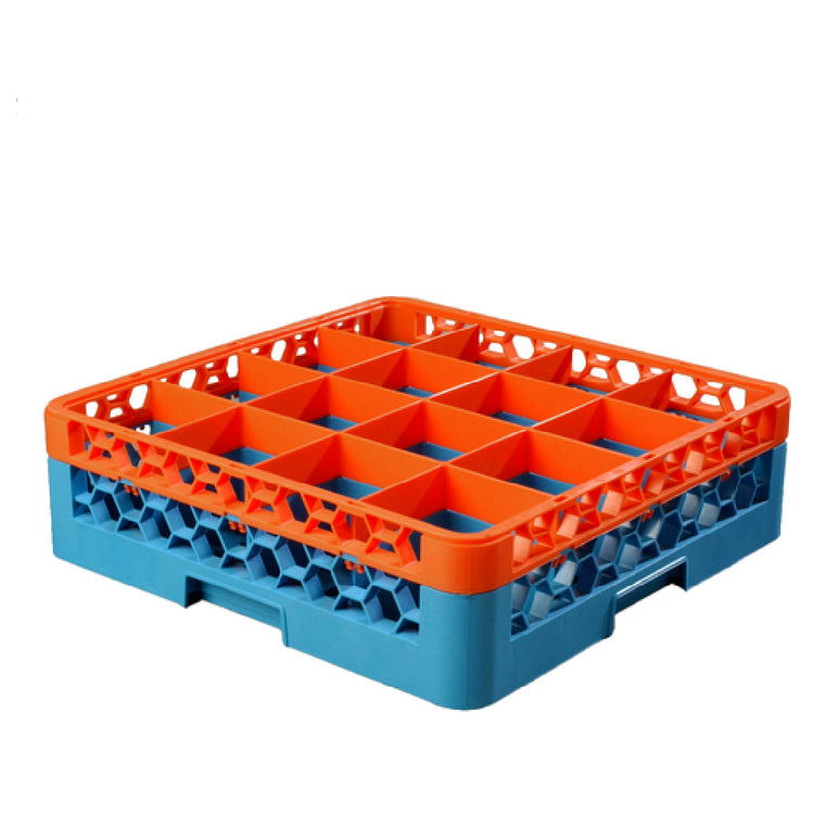The Carlisle RG16-1C412 Carlisle OptiClean™ Dishwasher Glass Rack stands out as a meticulously designed product that caters to the needs of diverse market segments within the food service and hospitality industry. This full-size glass rack, featuring 16 compartments measuring 4-7/16" x 4-7/16", ensures optimal organization and protection for glassware during dishwashing processes. The inclusion of a color-coded extender facilitates easy identification and efficient sorting, enhancing operational efficiency. With the capacity to accommodate glasses up to 4-3/16" in diameter and boasting an inside height of 5", it is versatile enough to handle various glass sizes. The double-wall construction provides enhanced durability, while the quick draining feature ensures faster drying times. Its positive stacking capability and four-way tracking system enable seamless integration into existing dishwashing operations. The comfort curve handles on all four sides ensure easy handling and maneuverability. Constructed from robust polypropylene with a textured finish, the rack is available in a distinctive orange/blue color combination, adding a touch of style to practicality. Certified by NSF, this glass rack confirms adherence to high standards of safety and hygiene. The Carlisle RG16-1C412 is a reliable asset for establishments focused on efficiency and glassware maintenance.
