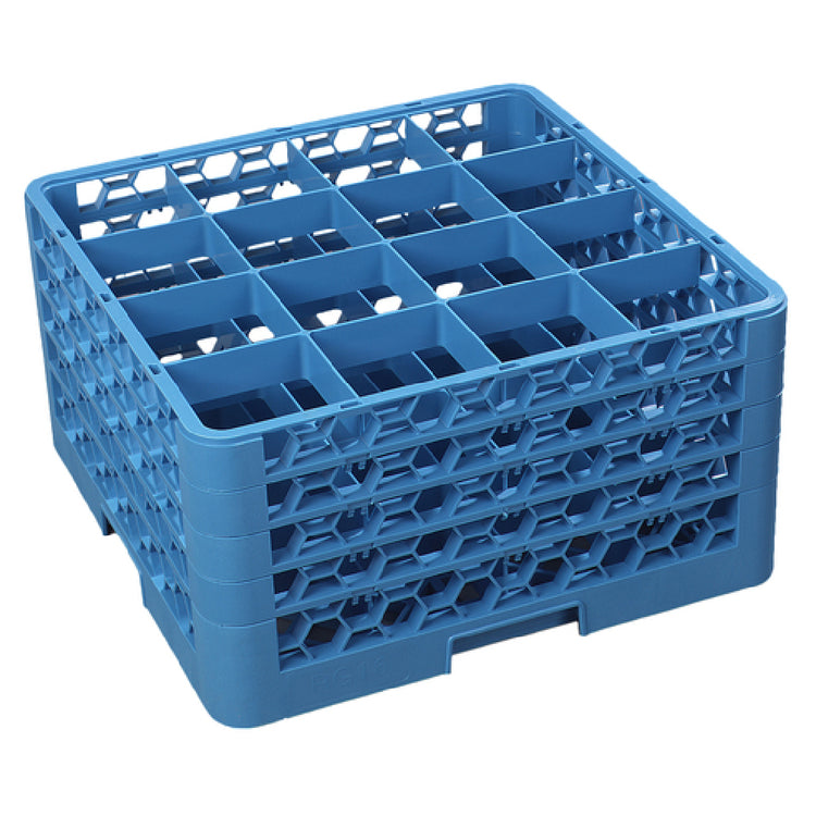 The Carlisle RG16-414 Carlisle OptiClean™ Dishwasher Glass Rack is engineered for optimal performance in both commercial and industrial dishwashing environments. This full-size glass rack is designed with 16 compartments, each measuring 4-7/16" x 4-7/16", providing ample space to securely hold glasses with a diameter of up to 4-3/16". The unique construction includes four extenders, accommodating an inside height of 10-1/4", which is ideal for various glass sizes. The rack is built with double-wall construction, ensuring durability and resistance to the demanding conditions of commercial kitchens. Notable for its quick draining capability, the Carlisle RG16-414 also features positive and four-way tracking, enhancing the efficiency of dishwashing operations. The comfort curve handles on all four sides facilitate easy handling and maneuverability. Made from sturdy polypropylene, this glass rack is crafted in a visually appealing blue color. It is NSF certified, assuring compliance with health and safety standards. This glass rack is particularly valuable for industries such as hospitality and catering, where maintaining high standards of glass cleanliness is crucial. The Carlisle RG16-414 stands out for its reliability and efficiency, making it a smart investment for businesses focused on quality service delivery.