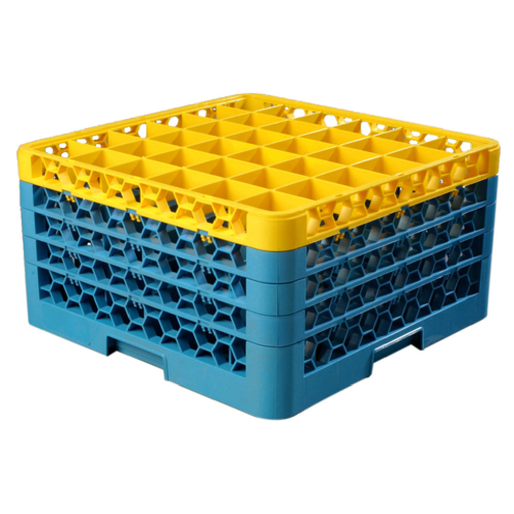 The Carlisle RG36-4C411 Carlisle OptiClean™ Dishwasher Glass Rack is engineered to enhance efficiency in commercial kitchens and catering environments. With 36-compartments each measuring 2-15/16" x 2-15/16", it is designed to securely hold glasses up to 2-11/16" in diameter, ensuring they are safely washed and dried. The full-size rack features a generous inside height of 10-1/4", accommodating a variety of glassware sizes. Its double-wall construction provides durability and stability, essential for high-usage scenarios. Quick draining is facilitated by a smart design that maximizes water flow, enhancing drying times. For added convenience and efficiency, the rack includes four-way tracking, allowing it to fit seamlessly into various dishwashing systems. The product is equipped with comfort curve handles on all four sides, ensuring ease of transport and handling. The inclusion of (4) color-coded extenders aids in organizational efficiency and easy identification. Constructed from sturdy polypropylene with a textured finish, it is available in a distinctive yellow/blue color scheme and is NSF certified, affirming its compliance with health and safety regulations. This product is ideal for restaurants, hotels, and catering services seeking reliable and efficient dishwashing solutions.
