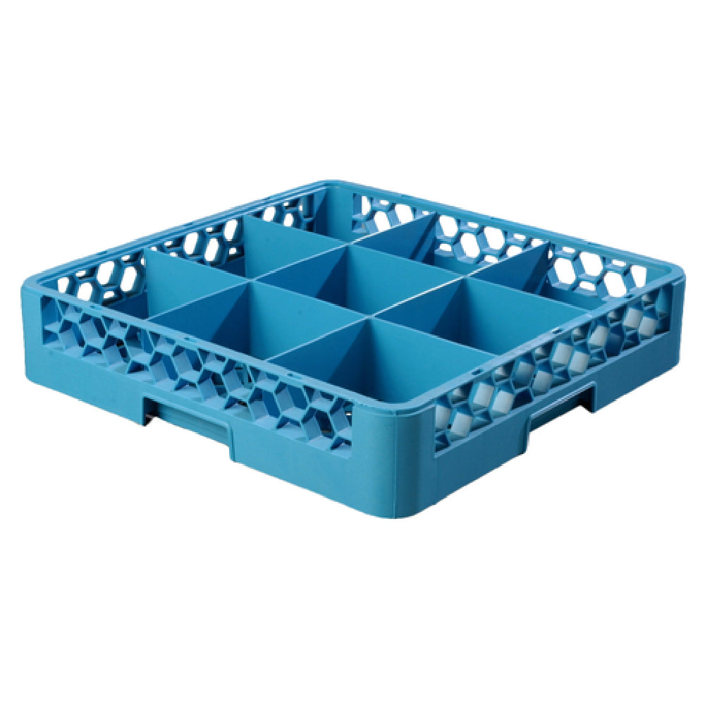 The Carlisle RG914 Carlisle OptiClean™ Dishwasher Glass Rack is a full-size glass rack equipped with 9 compartments, each measuring 5-13/16" x 5-13/16". This specialized dishwasher rack is engineered to securely hold glasses with a diameter of up to 5-9/16" and features an inside height of 3-1/4" to accommodate various glassware sizes. Its double-wall construction enhances durability and stability during washing, while the quick-draining design ensures efficient water removal. This glass rack incorporates positive stacking and four-way tracking, allowing for seamless integration into any commercial dishwashing workflow. Additionally, the comfort curve handles on all four sides provide ease of handling and transport. Made from durable polypropylene, this rack boasts a textured finish in a striking blue color. It is NSF certified, reflecting its adherence to public health and safety standards. The Carlisle RG914 is a versatile and reliable choice for restaurants, bars, and catering services looking to optimize their glassware cleaning processes with a focus on efficiency and safety.