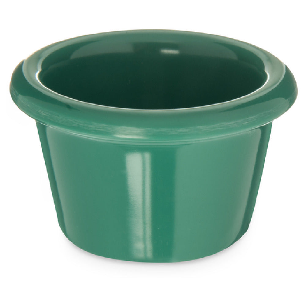 The Carlisle S27509 Carlisle Ramekin 1-1/2 Oz. 2-1/2" Dia. is expertly designed for both versatility and durability across various segments of the food service industry. This ramekin, with a capacity of 1-1/2 ounces and a diameter of 2-1/2 inches, provides an ideal solution for precise portion control in dining establishments. Constructed from high-quality melamine, it offers exceptional stain resistance and is safe for use in dishwashers, enhancing both hygiene and convenience in busy kitchen environments. The ramekin is built to withstand temperatures up to 212°F, making it suitable for a range of culinary applications from hot side dishes to chilled desserts. Its smooth surface contributes to a sophisticated presentation, while the stackable design allows for efficient storage and space-saving in professional kitchens. Available in a vibrant green color, this ramekin adds a touch of color to table settings. Certified by NSF, it assures compliance with strict public health standards. Whether used in restaurants, catering services, or institutional dining, the Carlisle S27509 ramekin provides a reliable and attractive option for enhancing food presentation and service efficiency.