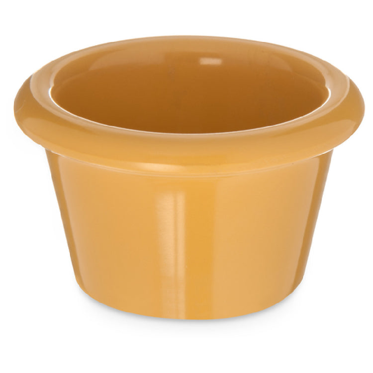 The Carlisle S27522 Carlisle Ramekin 1-1/2 Oz. 2-1/2" Dia. is a versatile and durable serving solution tailored for professional culinary environments. With a compact capacity of 1-1/2 ounces and a diameter of 2-1/2 inches, this ramekin is ideal for precise portion control, enhancing presentation in restaurants and catering services. Crafted from high-quality melamine, it presents a smooth surface that resists staining and maintains its vibrant honey yellow hue, ensuring longevity in high-traffic settings. The ramekin is engineered for temperatures up to 212°F, making it suitable for a range of food applications from hot appetizers to chilled desserts. Its stackable design optimizes storage efficiency, a crucial feature for busy kitchens with limited space. The product is dishwasher safe, promoting easy cleaning and sanitization, crucial in maintaining hygiene standards. Certified by NSF, it adheres to rigorous public health and safety standards, underscoring its suitability for the foodservice industry. The Carlisle S27522 ramekin embodies a blend of functionality and aesthetic appeal, offering a reliable solution for chefs and foodservice operators seeking dependable performance and a touch of color in their tableware collection.