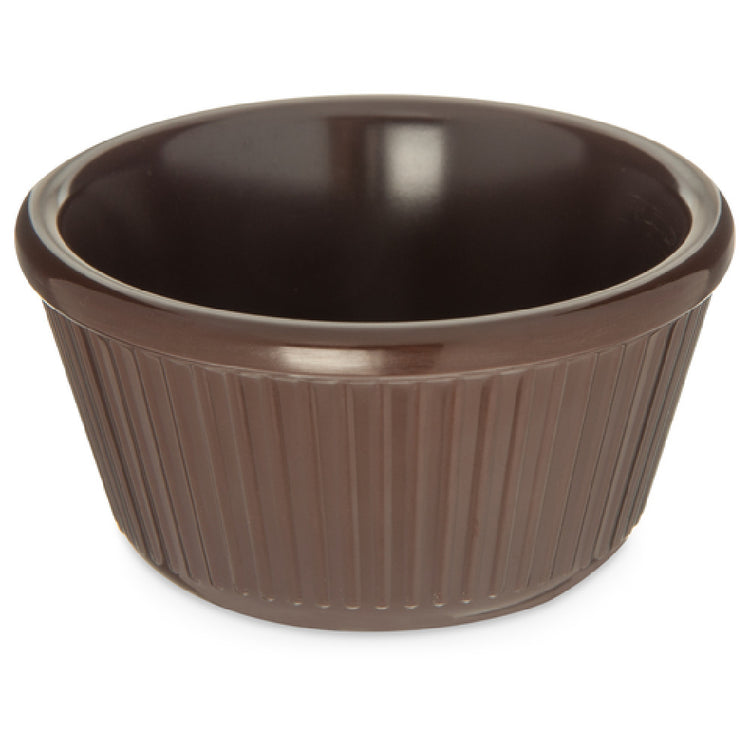 The Carlisle S28769 Carlisle Ramekin 4 Oz. 3-3/8" Dia. is a versatile and durable serving solution ideal for various food service applications. With a capacity of 4 ounces and a diameter of 3-3/8 inches, this ramekin is designed to cater to portion control needs in restaurants, cafeterias, and catering events. Its fluted design adds an elegant touch to table presentations, enhancing the dining experience. Made from high-quality melamine, this ramekin is stain resistant, ensuring longevity and ease of maintenance. It is also dishwasher safe, providing convenience in busy kitchen environments. The ramekin can withstand temperatures up to 212°F, making it suitable for serving both hot and cold dishes. Its stackable design allows for efficient storage, optimizing space in kitchen settings. Available in a rich chocolate color, this ramekin can complement various table settings and themes. Additionally, the product is NSF certified, ensuring compliance with food safety standards. The Carlisle S28769 is a practical choice for food service professionals looking for a reliable, stylish, and functional ramekin to enhance their service offerings.