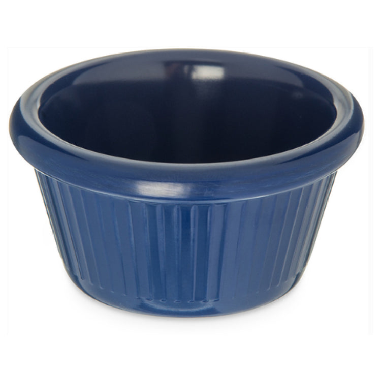 The Carlisle S29260 Carlisle Ramekin 2 Oz. 2-13/16" Dia. is a versatile kitchen essential designed for both professional and home use. With a capacity of 2 ounces and a diameter of 2-13/16 inches, this ramekin is perfect for serving individual portions of condiments, sauces, and desserts. Its fluted design adds an elegant touch to any table setting. Constructed from durable melamine, this ramekin is both stain resistant and safe for dishwasher use, ensuring easy cleanup and maintenance. It can withstand temperatures up to 212°F, making it suitable for a wide range of culinary applications. The stackable nature of the Carlisle S29260 allows for efficient storage, saving valuable space in busy kitchens. Available in a striking cobalt blue, it adds a vibrant pop of color to your dinnerware collection. This ramekin is NSF certified, reflecting its adherence to high public health and safety standards, and is free from BPA, ensuring it is safe for food contact. The Carlisle S29260 is ideal for restaurants, catering services, and home kitchens seeking a reliable, stylish, and durable solution for serving small portions.