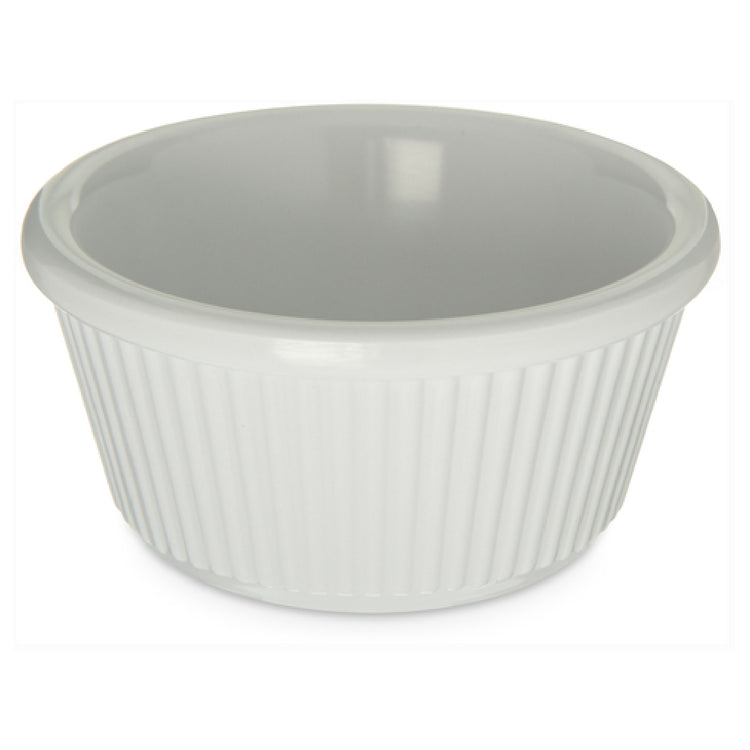 The Carlisle S29302 Carlisle Ramekin 3 Oz. 3-2/11" Dia. is a versatile and practical product designed for various food service applications. This 3 oz. ramekin, with a diameter of 3-2/11 inches, is an essential piece for both professional kitchens and home dining settings. Its fluted design not only adds a touch of elegance but also ensures grip and stability during handling. Made from durable melamine, this ramekin is stain-resistant and can withstand temperatures up to 212°F, making it suitable for a range of culinary uses, from serving sauces to baking. The dishwasher-safe feature enhances convenience, enabling easy cleaning and maintenance. Additionally, its stackable design is perfect for efficient storage in busy environments. The Carlisle S29302 ramekin is NSF certified, ensuring it meets public health and safety standards, and is BPA-free, affirming its safety for food contact. Available in a classic white color, it complements any table setting or buffet display, making it a versatile option for restaurants, caterers, and home cooks seeking reliable, high-quality serveware. This ramekin's practical features and robust construction offer value across different segments of the food service industry, from casual eateries to high-end dining establishments.