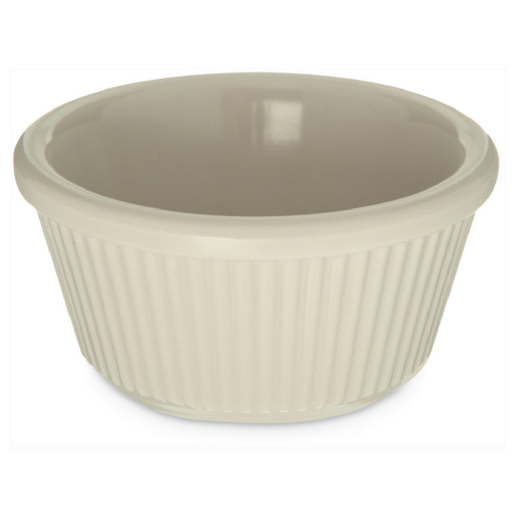 The Carlisle S29342 Carlisle Ramekin 3 Oz. 3-2/11" Dia. is a versatile and essential addition to any dining establishment or kitchen, offering a perfect blend of functionality and durability. With a capacity of 3 ounces and a diameter of 3-2/11 inches, this ramekin is designed to accommodate a variety of servings, from condiments to desserts. Its fluted design adds an elegant touch to presentation, enhancing the dining experience. Constructed from high-quality melamine, the ramekin is both stain resistant and dishwasher safe, ensuring ease of maintenance and longevity. This durable material also allows the ramekin to withstand temperatures up to 212°F, making it safe for a range of applications. The ramekin is stackable, optimizing storage space in busy kitchens. Available in a classic bone color, it seamlessly complements a wide array of table settings. As a product of CFS Brands, the ramekin adheres to NSF standards, ensuring safety and quality. Additionally, it is BPA-free, highlighting a commitment to health-conscious dining solutions. The Carlisle S29342 ramekin is an ideal choice for restaurants, catering services, and home chefs seeking reliable and stylish serving options that meet rigorous industry standards.
