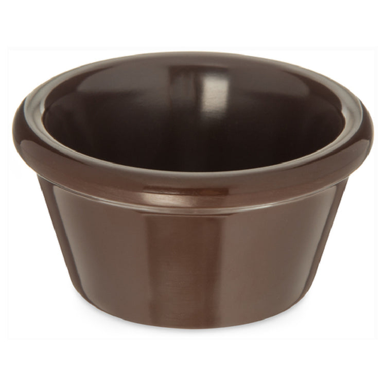 The Carlisle S85269 Carlisle Ramekin 2 Oz. 2-5/8" Dia. is a versatile dining accessory suitable for a variety of culinary settings. With a compact 2-ounce capacity and a diameter of 2-5/8 inches, this ramekin is designed for individual servings of sauces, dips, and condiments. Its smooth surface ensures easy cleaning and handling, while its dishwasher-safe nature adds convenience for busy kitchens. Constructed from durable melamine, the ramekin is stain-resistant and can safely withstand temperatures up to 212°F, making it suitable for both hot and cold applications. The stackable design contributes to efficient storage and space-saving in commercial environments. Offered in a rich chocolate color, it complements a wide range of table settings. Importantly, it meets NSF standards for commercial food equipment and is BPA Free, emphasizing safety and quality. This ramekin is an ideal choice for restaurants, catering services, and home use, delivering consistent performance and aesthetic appeal in every setting.