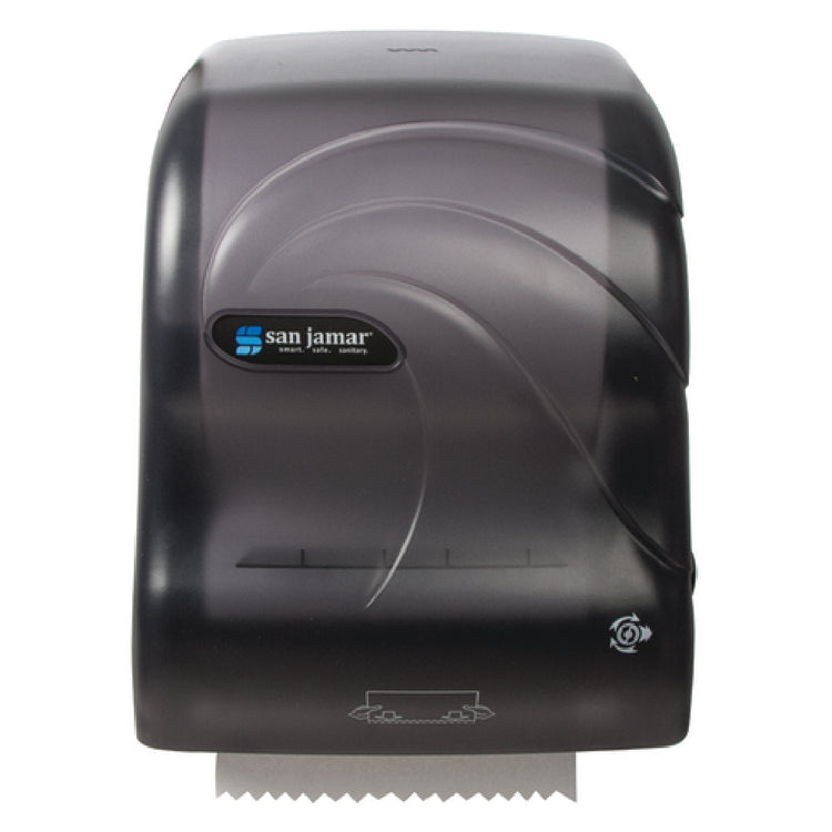 The Carlisle T7490TBK San Jamar Simplicity Hands Free Oceans® Paper Towel Dispenser stands out as a robust and efficient solution in the realm of sanitary maintenance for various industry segments. This dispenser, with dimensions of 12-3/8"W x 9-1/2"D x 14-5/8"H, is designed for wall mounting and features a secure locking mechanism. Its touchless operation, combined with automatic mechanical cutting, dispenses a consistent 10" portion of roll towel, ensuring hygiene and reducing waste. Notably, the dispenser operates without the need for batteries, making it a reliable and cost-effective choice for high-traffic environments. It accommodates one 8" wide roll and is constructed from high impact plastic, offering durability in demanding settings. The translucent black pearl finish not only adds an aesthetic appeal but also allows for easy monitoring of paper levels. This dispenser is ideal for settings that prioritize sanitary conditions and efficiency, such as healthcare facilities, educational institutions, and corporate offices, providing a seamless integration of functionality and style. Its sturdy build and consistent performance make it a valuable asset for maintaining high hygiene standards in diverse operational environments.