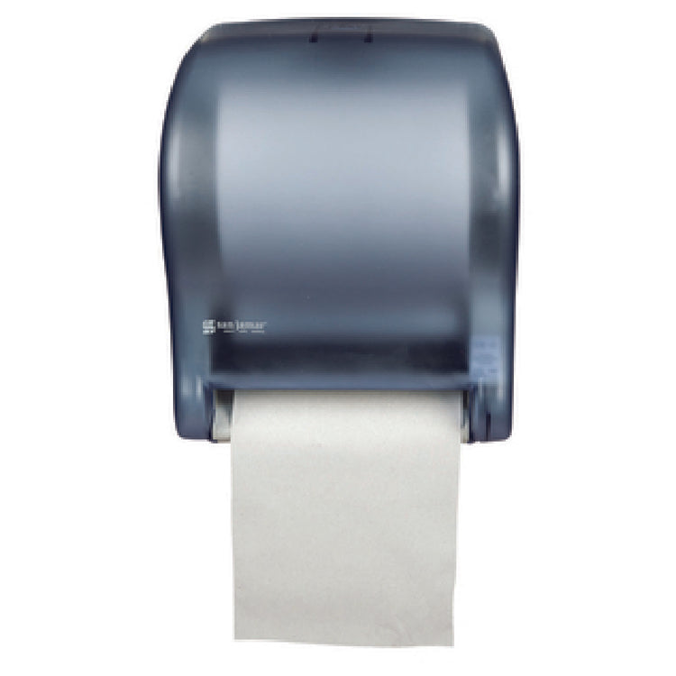 The Carlisle T8000TBL San Jamar Tear-n-Dry Essence™ Classic Towel Dispenser is a compact and efficient solution for dispensing paper towels in a hygienic touchless manner. Measuring 11-3/4"W x 9-1/8"D x 14-7/16"H, this wall-mounted unit is designed to fit seamlessly into various spaces, providing versatility for different industries such as hospitality, healthcare, and food service. It dispenses 10" length towel paper and holds one 8" wide roll with an 8" diameter, ensuring a generous supply of towels for high-traffic areas. The dispenser operates using four D-cell batteries, offering a reliable power source without the need for hardwiring. Constructed from impact-resistant plastic, it withstands daily wear and tear while maintaining its integrity. The translucent arctic blue finish not only adds a modern touch but also allows for easy monitoring of towel levels. Additionally, the dispenser includes a secure lock to prevent tampering, making it a practical choice for public restrooms and commercial facilities. The Carlisle T8000TBL San Jamar Tear-n-Dry Essence™ is engineered for functionality and durability, addressing the needs of different market segments with its innovative, user-friendly design.