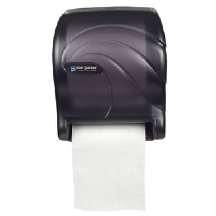 The Carlisle T8090TBK San Jamar Tear-n-Dry Essence™ Oceans® Towel Dispenser is a compact, touchless solution designed for efficient hygiene management. Measuring 11-3/4" in width, 9-1/8" in depth, and 14-7/16" in height, this wall-mountable dispenser is crafted for convenience and space-saving utility. It dispenses a consistent 10" length of towel paper and is capable of holding one 8" wide roll with a diameter of up to 8". Constructed from high-impact plastic, the dispenser's translucent black pearl finish adds a sleek aesthetic while allowing easy monitoring of towel levels. The unit requires four D-cell batteries (not included), providing a reliable power source for its automatic dispensing mechanism. Equipped with a lock, it ensures security and reduces the risk of paper theft or contamination, making it an ideal choice for high-traffic washrooms in commercial spaces such as office buildings, restaurants, and hospitals. Its durable construction and efficient dispensing system cater to diverse industry needs, reinforcing hygiene standards and minimizing waste. The Carlisle T8090TBK is engineered to deliver consistent performance and durability, appealing to businesses seeking a robust and dependable towel dispensing solution.
