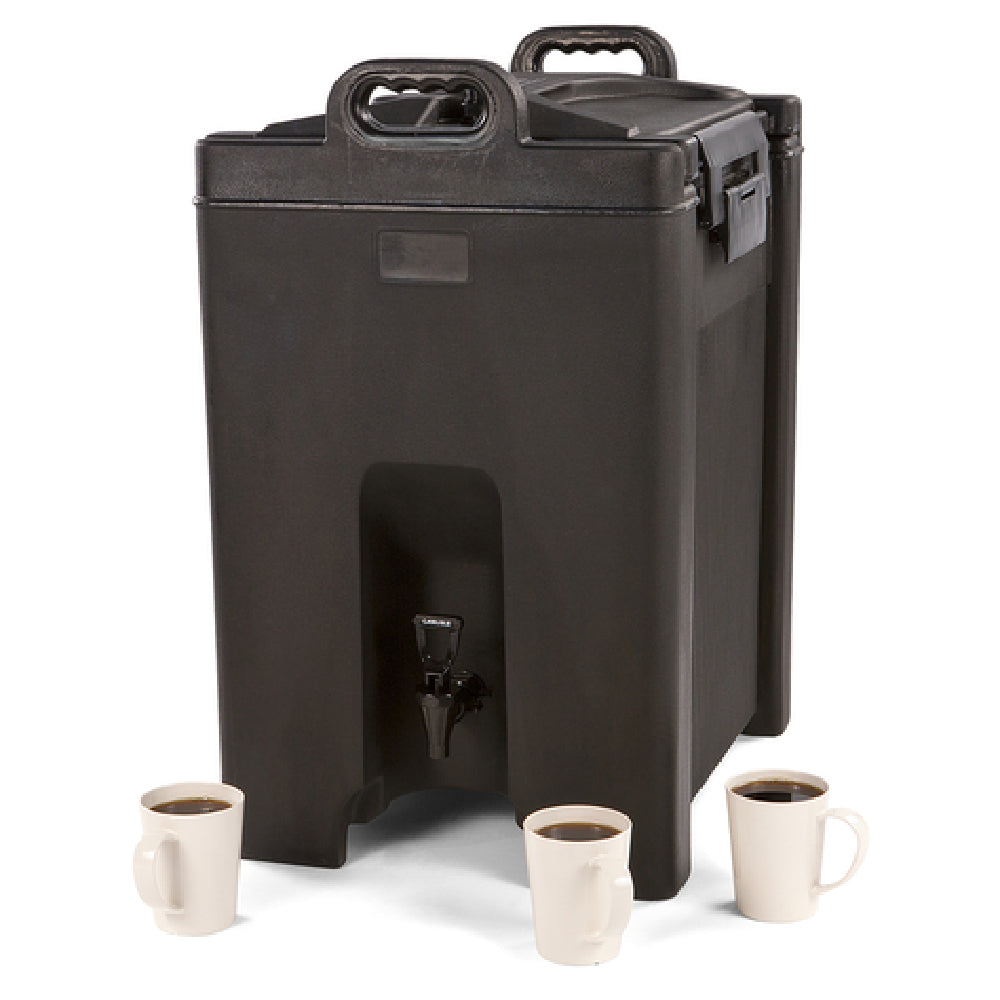 The Carlisle XT1000003 Carlisle Cateraide™ XT Beverage Server 10 Gallon Insulated is a high-capacity, insulated beverage solution designed for the food service industry. With a 10-gallon volume, it caters to large events and catering services, ensuring efficient beverage management. Its innovative Sure-Latch™ wide design with latches mounted into steel-reinforced plates provides exceptional durability and secure closure. The convex lid is equipped with a pop-up vent, enhancing pressure management and maintaining optimal temperature control. Additionally, an O-ring seal further ensures the preservation of beverage temperatures. This server features a spring-action drip-less faucet, reducing spillage and enhancing user convenience. Easy-grip formed handles make transportation straightforward, while its stackable construction optimizes storage space. Made from robust polyethylene, the server offers both durability and ease of maintenance. Available in a sleek black finish, it adds a professional touch to any setting. As an NSF-certified product, it meets stringent public health standards, underscoring its quality and safety. Proudly made in the USA, the Carlisle Cateraide™ XT Beverage Server is a reliable and practical choice for those seeking a combination of functionality and durability in beverage service.