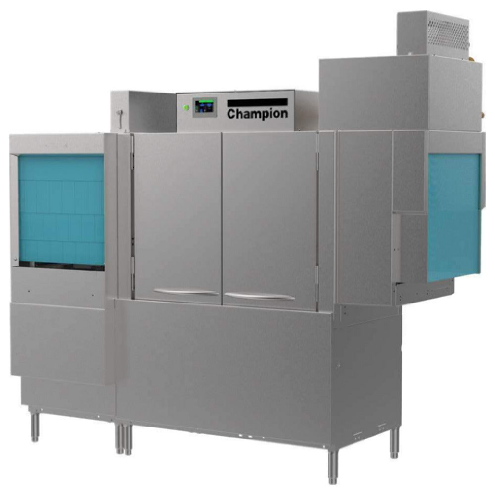 The Champion 76 PRO-FF-HR Pro Series 76”W Rack Conveyor Dishwasher is a highly efficient, industrial-grade machine designed to meet the rigorous demands of commercial kitchens. Featuring a 54” single tank with a 22” front feed prewash and a vent stack, this dishwasher ensures comprehensive cleaning and efficiency. Its Proportional Rinse system and Progressive anti-jam drive enhance operational reliability. The top-mounted Prodigy series HMI user interface and Proactive maintenance software optimize user interaction and maintenance tracking. With a capacity to process 255 racks per hour and using only 100 gallons per hour, it incorporates an energy sentinel with idle pump shut-off for energy efficiency. Notable design elements include a single-piece wash chamber, stainless steel wash arms, and an internal removable scrap basket. Its 20” standard vertical clearance accommodates 18” x 26” sheet pans, while insulated hinged access doors ensure leak-proof operation. It comes equipped with automatic tank fill, door safety switches, and leak-proof ball valve drains. Constructed from heavy-gauge stainless steel, it features electric tank heat with heat recovery, and an internal booster heater. Additional features include vent fan control, dual-piece scrap screens, and a single-point machine and booster connection. This model includes a 20" x 20" peg rack and a flat rack, is NSF and cULus certified, and is made in the USA.