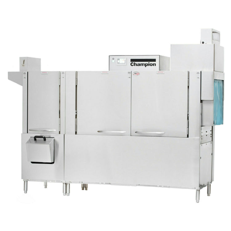 The Champion 86 PRO-240/60/3 Pro Series 64”W Two-tank Rack Conveyor Dishwasher with 22” Pre-wash is a high-performance commercial dishwasher tailored for the food service industry. This machine boasts a proportional rinse and progressive anti-jam drive system, ensuring smooth operations and minimizing downtime. Featuring a top-mounted Prodigy series HMI user interface, it simplifies control and monitoring. The dishwasher is designed with proactive maintenance software, optimizing longevity and performance. It processes up to 348 racks per hour, utilizing 100 gallons of water per hour, with an energy sentinel feature for idle pump shut-off, making it both efficient and eco-friendly. The single-piece hood design and stainless steel upper & lower wash arms manifolds enhance durability and cleaning efficiency. It accommodates 18” x 26” sheet pans with a 20” standard vertical clearance. The unit is equipped with full 180° opening leak-proof insulated hinged access doors, automatic tank fill, and leak-proof ball valve drains for superior operational functionality. Additional features include an internal removable scrap basket, dual-piece scrap screens, and auto delime function. Constructed with heavy-gauge stainless steel, including base and legs, it is built to withstand rigorous use. Certified by NSF, cULus, and ENERGY STAR, this dishwasher is made in the USA.