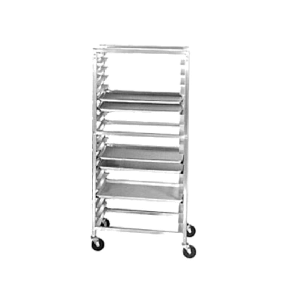 The Channel 411AKD Bun Pan Rack Knock Down Knock Down Series is an adeptly designed storage solution featuring a robust aluminum construction that ensures durability and longevity. Measuring 28.5"W x 18"D x 70.25"H, this rack is engineered to accommodate (20) 18" x 26" pans with ease. It incorporates a side load mechanism complemented by 3" angle spacing to facilitate efficient use of space. Built for versatility, the rack is equipped with 5" swivel stem casters model #025KD, enhancing mobility and adaptability in busy environments. With a net weight of 29lbs, this rack does not include an additional 50 lbs. for pallet weight, making it a lightweight yet sturdy option. Certified by NSF, it meets rigorous public health and safety standards, making it suitable for various market segments including bakeries, restaurants, and catering services. Its knock-down design allows for easy assembly and storage, making it a practical choice for professionals seeking both form and function in equipment. The Channel 411AKD Bun Pan Rack distinguishes itself through its blend of practicality and efficiency, making it an indispensable tool for food service operations requiring reliable and flexible storage solutions.