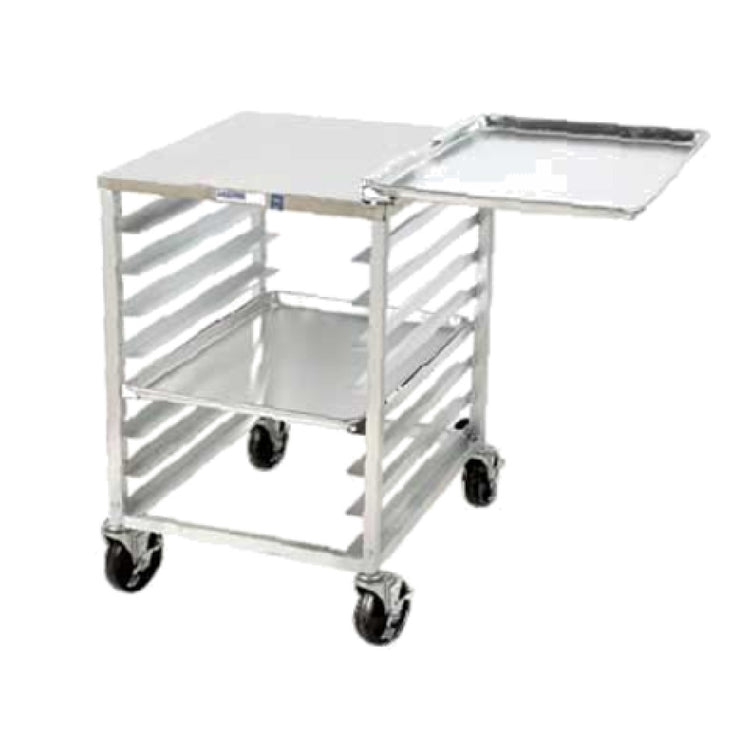 The Channel RG102 Bun Pan Rack Under-Counter Outrigger Slicer Stand is a meticulously engineered kitchen asset, designed for efficient storage and accessibility in busy culinary environments. Measuring 20.5"W x 26"D x 32"H, this rack offers a compact solution without sacrificing capacity, as it accommodates (6) 18" x 26" pans or (12) 13" x 18" pans, with each shelf capable of holding two pans. Its aluminum construction paired with a stainless steel top ensures durability and longevity, making it a reliable choice for professionals. The end load design and 4" angle spacing facilitate easy loading and unloading of pans, aiding in swift kitchen operations. Equipped with 5" swivel stem casters, model # CSS45O, the stand provides seamless mobility, allowing it to be moved across various workstations with ease. Weighing 33 lbs (excluding the 50 lbs pallet weight), it maintains a balance of sturdiness and maneuverability. Proudly made in the USA and NSF certified, this rack underscores quality assurance and adherence to safety standards, making it a superior choice for different market segments from small-scale eateries to large-scale culinary operations. The Channel RG102 Bun Pan Rack is an essential tool for optimizing kitchen workflows.