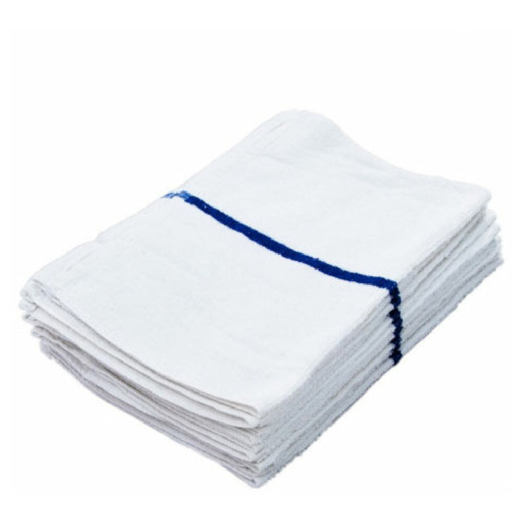 The Chef Approved 167701BRTBLS Ribbed Bar Towel is a versatile and durable accessory designed to meet the needs of various professional environments. Measuring 19" x 16", this towel offers ample coverage for handling a wide range of kitchen and bar tasks. Each set includes a dozen towels, collectively weighing 32oz, providing a substantial and absorbent solution for drying and cleaning. Constructed from 100% cotton, the towel ensures superior absorbency and softness, making it gentle on surfaces while effectively managing spills and messes. The ribbed design enhances its absorbency and durability, ensuring long-lasting performance. This towel is machine washable, allowing for convenient and efficient cleaning, essential for maintaining hygiene in busy settings. Its white color, accented with a blue stripe, provides a classic and professional appearance, suitable for both front-of-house and back-of-house applications. The Chef Approved 167701BRTBLS Ribbed Bar Towel is an ideal choice for restaurants, bars, and catering services seeking reliable and high-quality textile solutions to support their operational needs.