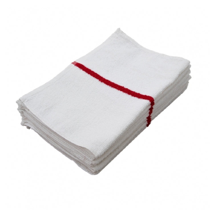 The Chef Approved 167701BRTRDS Ribbed Bar Towel is a premium cleaning solution designed for high-demand environments such as bars, restaurants, and catering services. Measuring 19" x 16", this towel provides ample surface area for a variety of cleaning tasks. Crafted from 100% cotton, it ensures maximum absorbency and durability, traits that are essential in fast-paced and demanding settings. The towel is ribbed, enhancing its grip and scrubbing capabilities, making it particularly effective for tough cleaning tasks. Weighing 32oz per dozen, these towels are substantial, offering a solid feel that professionals appreciate. The classic white color with a red stripe not only delivers a professional appearance but also allows for easy identification and color coding in multi-towel systems. Being machine washable, the 167701BRTRDS is convenient to care for, ensuring that it remains fresh and hygienic after each use. Its construction and design are tailored to meet the rigorous standards of culinary and hospitality professionals, offering a reliable and efficient tool for maintaining cleanliness and hygiene in any food service establishment. Whether for wiping down counters or cleaning spills, the Chef Approved Ribbed Bar Towel is a versatile and valuable addition to any professional cleaning arsenal.