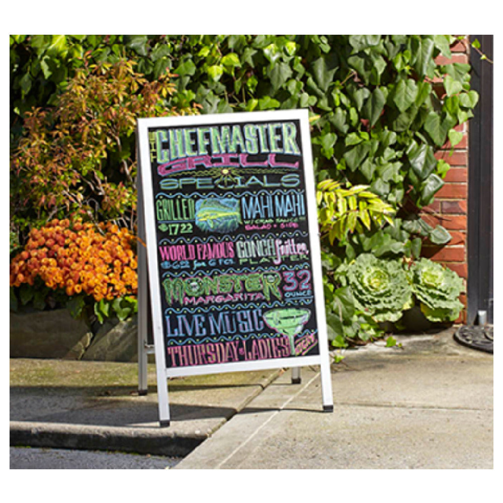 The Chef Master 90034 Chef-Master™ Sidewalk Sign is a meticulously designed advertising tool, crafted to enhance visibility and engagement for businesses. This two-sided sign features a sleek black surface that serves as an ideal backdrop for chalk or liquid chalk markers, allowing for clear and vibrant messaging. Its portable and lightweight construction ensures easy transportation and setup, making it a versatile choice for various commercial environments. The adjustable non-skid feet ensure stability on different surfaces, preventing accidental movement or tipping over. Built with a durable aluminum frame and hinge, this sidewalk sign exhibits impressive weather resistance, making it suitable for both indoor and outdoor use. The aluminum construction not only guarantees longevity but also maintains the sign's sleek appearance over time. This product is an excellent fit for restaurants, cafes, retail shops, and any business seeking to capture pedestrian attention. Its robust design and adaptability cater to diverse market segments, providing a reliable solution for promotional needs. Whether placed on a bustling sidewalk or within a store, the Chef Master 90034 Chef-Master™ Sidewalk Sign stands out as an effective and durable communication tool, designed to withstand the demands of everyday commercial use.
