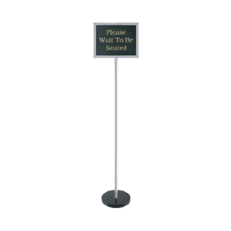 The Chef Master 90038 Chef-Master™ Teller Sign stands at an impressive height of 60 inches, designed with precision for seamless display functionality. It features (8) double-sided 11 x 14-inch P.V.C. signs, offering versatility with 15 gold silk-screened messages and 1 blank sign for customizable communication. This innovative product ensures that all signs can be effortlessly stored within its aluminum frame, enhancing organization and space efficiency. Supported by a sturdy steel pole and base, the sign maintains stability, while its chrome finish adds a touch of elegance, making it suitable for various professional environments. The Chef Master 90038 is particularly suited for industries that require clear, prominent signage, such as hospitality, retail, and corporate events, where visual communication is key. Its durable construction and high-quality materials ensure longevity and consistent performance, providing a reliable solution for businesses seeking to enhance their visual display capabilities. Whether used to convey promotional messages or essential information, this teller sign is a strategic asset, blending functionality with sleek design.