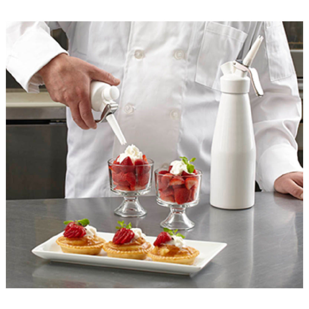 The Chef Master 90077 Chef-Master™ Whipped Cream Dispenser is a robust culinary tool designed exclusively for professional use, offering a generous capacity of 2 pints (1.0L). This dispenser is meticulously crafted to meet the demanding standards of professional kitchens, providing a superior performance that enhances culinary creativity. The Chef-Master™ Whipped Cream Dispenser is characterized by its professional-grade construction, ensuring durability and reliability in high-pressure environments. Its significant volume capacity allows chefs to prepare and dispense whipped cream efficiently, streamlining operations in busy kitchens. The precision-engineered components of this dispenser enable chefs to achieve consistent results, making it a valuable asset for professionals who require both performance and consistency. The design and functionality of the Chef-Master™ Whipped Cream Dispenser cater to a wide range of culinary applications, making it indispensable for pastry chefs, bakers, and other industry professionals who value precision and quality in their culinary creations. This dispenser stands out in the market for its superior capacity and professional-grade design, underscoring its suitability for commercial kitchens that demand the highest standards of culinary tools. Its advanced features and robust construction make it an essential tool for culinary experts aiming to enhance their operational efficiency and product quality.