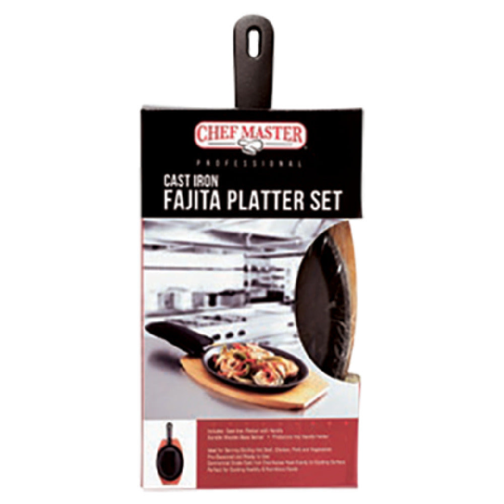 The Chef Master 90200 Chef Master™ Fajita Platter Set is a meticulously designed set catering to culinary professionals and enthusiasts across various market segments. This set includes a robust 16-inch by 7-1/2-inch by 1-1/5-inch O.A. oval sizzler that is expertly crafted for optimal heat retention and distribution, thanks to its pre-seasoned cast iron construction. Accompanying the sizzler is a 12-1/4-inch by 7-1/2-inch by 1/2-inch wood base server, which adds a touch of elegance to the presentation while providing a sturdy and heat-resistant platform. For safety and convenience, the set also includes a protective hot handle holder, ensuring a secure grip when transporting sizzling dishes from the kitchen to the dining area. This feature-rich set is ideal for restaurants, catering businesses, and home cooks aiming to deliver authentic, beautifully presented fajita dishes. The thoughtful combination of materials and design elements in the Chef Master 90200 delivers both functionality and aesthetic appeal, making it a versatile and essential tool in any food service operation focused on delivering exceptional culinary experiences.