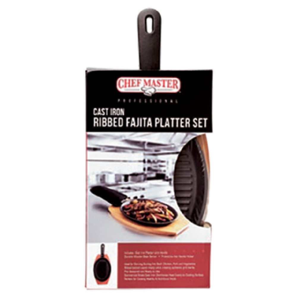 The Chef Master 90201 Chef Master™ Fajita Platter Set is a meticulously designed culinary accessory that presents an ideal blend of functionality and style for diverse culinary settings. This set includes a precisely measured oval ribbed sizzler with dimensions of 16" x 7-1/2" x 1-1/5", crafted from durable, pre-seasoned cast iron, ensuring longevity and exceptional heat retention for cooking. Accompanying the sizzler is a 12-1/4" x 7-1/2" x 1/2" wood base server, providing a stable and aesthetically pleasing presentation for your culinary creations. For user safety and comfort, the set features a protective hot handle holder, making it safer and easier to transport sizzling dishes from the kitchen to the table. This platter set is an excellent choice for restaurants and home chefs seeking to enhance their presentation of tex-mex dishes, particularly sizzling fajitas, while maintaining practical usability. The robust construction and thoughtful design of the Chef Master 90201 make it an asset in any kitchen, offering a reliable solution for serving hot dishes directly to diners. Its versatility and durability cater to the needs of professional chefs and cooking enthusiasts alike, making it a valuable addition to any culinary toolkit.