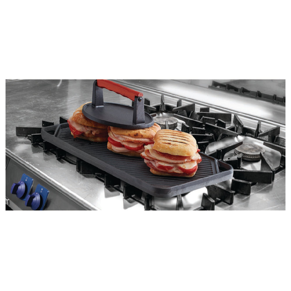 The Chef Master 90202 Chef Master™ Griddle is a versatile kitchen essential featuring a reversible ribbed and flat surface, designed to meet the varied demands of professional and home chefs alike. Measuring 16-4/5 inches by 9-1/2 inches with a height of 4/5 inches, this griddle provides ample cooking space for a range of culinary applications. Its dual-surface functionality allows users to switch effortlessly between grilling and flat-top cooking, accommodating diverse recipes and techniques. The raised edges serve a dual purpose by helping to contain cooking ingredients and minimize spills, enhancing the overall cooking experience. Constructed from durable cast iron, the Chef Master 90202 Griddle is pre-seasoned, which promotes non-stick properties and enhances flavor profiles in foods. This griddle is an ideal choice for those seeking a reliable and multi-functional addition to their cooking equipment, whether in a restaurant setting or a home kitchen. Its robust design and practical features make it a valuable tool for achieving professional-quality cooking results across various culinary environments.