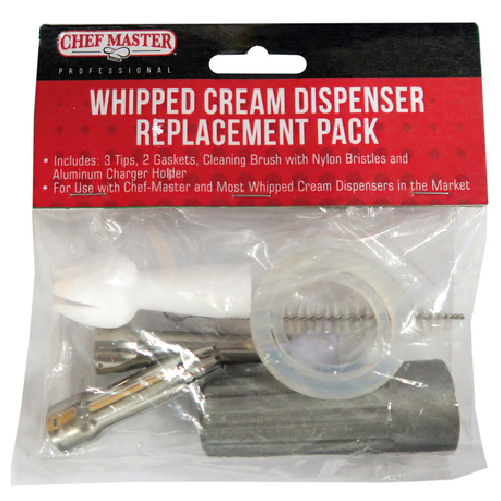 The Chef Master 90225 Chef-Master™ Accessory Set is a comprehensive 7-piece kit designed specifically for enhancing the functionality of whipped cream dispensers. This set includes three precision-engineered nozzle tips, which offer versatility for creating a variety of whipped textures with professional finesse. To ensure a perfect fit and optimal performance, the set comes with two robust gaskets. Maintenance is made effortless with the inclusion of a cleaning brush featuring durable nylon bristles, allowing for effective cleaning without damaging delicate parts. Additionally, the set includes a sturdy aluminum charger holder, ensuring secure and efficient handling of cream chargers. Each component of the Chef-Master™ Accessory Set is crafted to meet the demands of both commercial kitchens and enthusiastic home chefs. Its thoughtful design and high-quality materials deliver lasting reliability and performance, making it a valuable enhancement for any whipped cream dispenser. This set is ideal for culinary professionals seeking precision and efficiency, as well as for bakery establishments aiming for high-volume output and consistent quality. The Chef Master 90225 accessory set represents a unique value proposition by offering essential tools that elevate the capabilities of whipped cream dispensers, catering to diverse market needs within the food service industry.