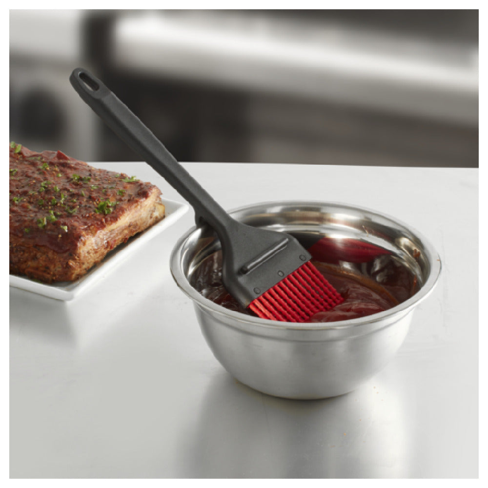 The Chef Master 90249 Basting Brush is a versatile tool designed for culinary professionals and home cooks alike, featuring a 3-inch width and a 6-1/4-inch long handle for optimal reach and precision. This innovative basting brush is crafted with beaded silicone bristles, ensuring a gentle and even application of sauces and marinades. Its unique design allows it to conveniently hang on containers and cookware, providing ease of storage and accessibility in busy kitchens. Engineered to withstand high temperatures, it is heat resistant up to 500°F (260°C), making it suitable for a variety of cooking techniques, including grilling and roasting. Additionally, the Chef Master 90249 Basting Brush is dishwasher safe, ensuring effortless cleaning and maintenance. This product is ideal for use in commercial kitchens, foodservice operations, and home cooking environments, offering reliability and durability. With its thoughtful design and focus on functionality, the Chef Master 90249 Basting Brush stands out as a valuable tool for enhancing food preparation processes across different culinary markets.