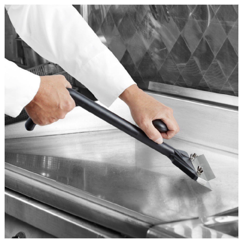 The Chef Master 90254 Chef-Master™ Griddle Scraper embodies both practicality and durability, making it a staple in the culinary industry. This robust tool features a 16-3/10-inch overall length, complemented by a 5-1/2-inch stainless steel blade, known for its resilience and efficiency in cleaning griddles. Engineered with an ergonomic handle and a top handle, it ensures a comfortable grip and enhanced control during use, reducing strain on the user's hand. The addition of a safety splash guard serves as a protective feature to prevent hot oil or debris from causing injury, underscoring its utility in fast-paced kitchen environments. Its heavy-duty construction is further validated by the ETL certification, which signifies adherence to high safety and performance standards. Ideal for professional chefs and food service establishments, this griddle scraper is designed to meet the rigorous demands of commercial kitchens. Its technical specifications not only highlight its functional prowess but also appeal to various market segments, from restaurant owners seeking reliable kitchen tools to chefs in search of equipment that ensures both safety and efficiency. This scraper’s combination of features makes it a vital asset for maintaining cleanliness and hygiene in culinary settings.