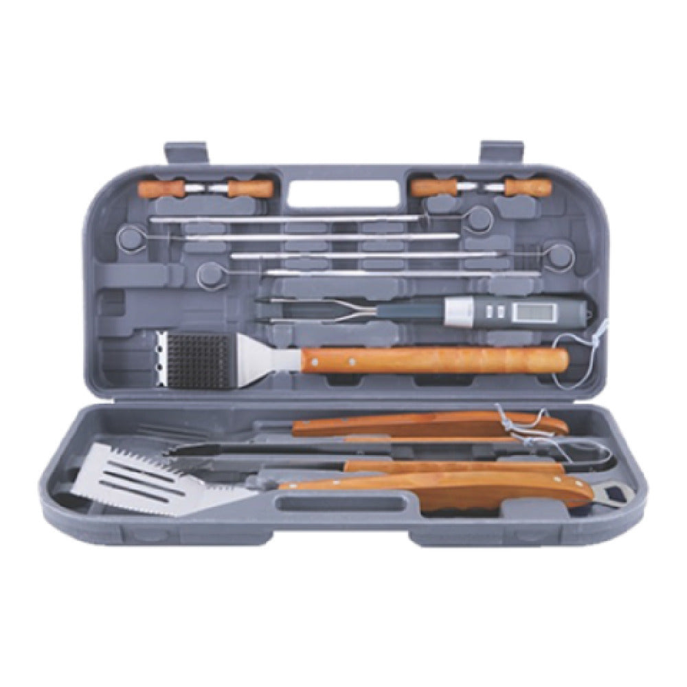 The Chef Master 94122X Mr. Bar-B-Q® Grilling Tool Set is a comprehensive 12-piece collection meticulously designed for barbecue enthusiasts seeking high-quality grilling tools. Featuring a 4-in-1 spatula, this set combines efficiency with versatility, allowing users to flip, slice, tenderize, and open bottles seamlessly. The set includes a pair of sturdy tongs and a Thermo fork, providing precise control and temperature monitoring for perfectly cooked dishes. A grill brush is included for maintaining grill cleanliness and longevity. Additionally, the set comprises four skewers and four corn holders, facilitating diverse grilling options from kebabs to corn-on-the-cob. All components are conveniently housed in a portable carrying case, ensuring organized storage and easy transportation. Crafted for both amateur and professional grillers, this tool set meets diverse culinary needs, making it an essential addition to any grilling setup. Whether for backyard gatherings or professional catering, the Chef Master Grilling Tool Set offers robust functionality and convenience, enhancing the grilling experience across various market segments within the culinary industry.
