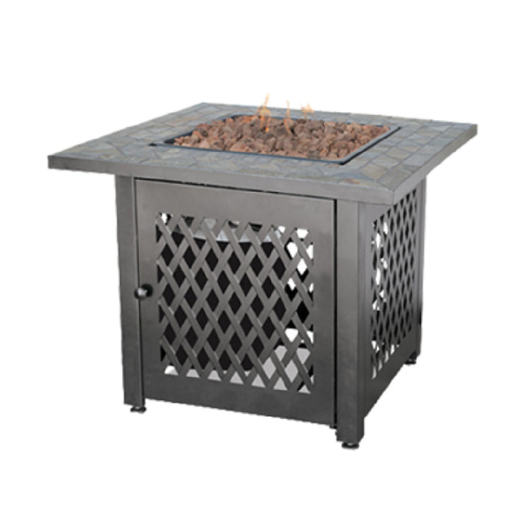 The Chef Master GAD1429SP Blue Rhino® UniFlame® Outdoor Gas Firebowl is a versatile and elegantly designed fire feature with a square shape and dimensions of 30"W x 30"D x 24"H, making it an ideal centerpiece for outdoor settings. It features a slate tile mantel that complements its aesthetic appeal while providing functional space. The firebowl integrates a control panel equipped with an electronic ignition system, ensuring a seamless start-up process. Constructed with a durable steel bowl and a high-quality stainless steel burner, this firebowl is built to withstand outdoor elements. It operates on LP gas with a powerful output of 30,000 BTU, offering substantial heat for various outdoor environments. Additionally, the package includes lava rocks, enhancing the visual and heat distribution properties. The firebowl's steel base provides stability and longevity. It holds certifications like CSA Star and CSA Flame, emphasizing its safety and quality standards. This outdoor gas firebowl is perfectly suited for residential patios and commercial outdoor dining spaces, offering both style and functionality to enhance the ambience and warmth of any gathering. Its thoughtful design and robust construction make it a valuable asset for anyone seeking a reliable and visually appealing outdoor heating solution.