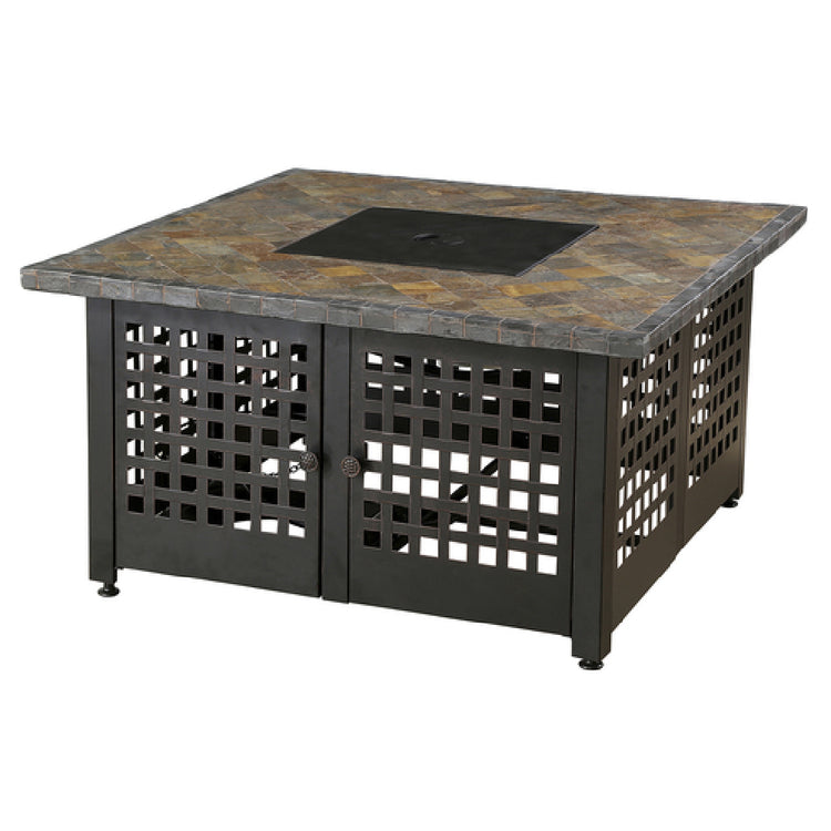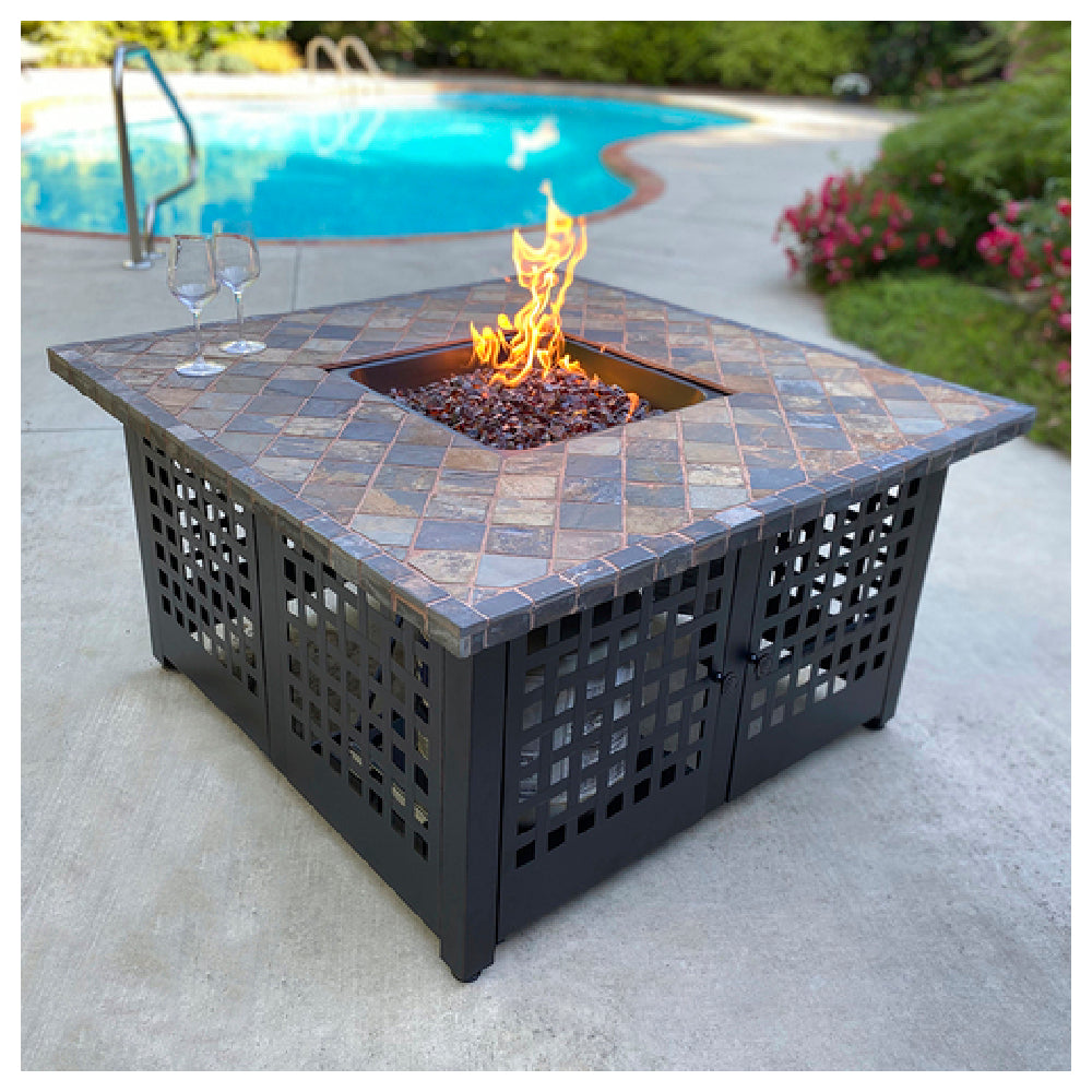 The Chef Master GAD15286G Outdoor Fire Pit is a square, meticulously designed unit measuring 41-3/10" x 41-3/10" x 22-2/5"H, making it a substantial centerpiece for any outdoor setting. This fire pit boasts a handcrafted slate/marble mantel, offering both aesthetic appeal and durability. It is equipped with a porcelain steel bowl and a stainless steel burner, ensuring robust functionality and long-lasting performance. The electronic ignition and hidden control panel provide ease of use, enhancing user experience with seamless operation. Included with the fire pit are bronze fire glass, adding an elegant touch to the flames, and a protective cover to safeguard the unit from the elements. Fueled by LP gas (not included), this fire pit delivers an impressive 50,000 BTU, providing ample warmth for outdoor gatherings. It is CSA Star and CSA Flame certified, ensuring compliance with safety standards. The Chef Master GAD15286G Outdoor Fire Pit is perfectly suited for a range of markets, from residential users seeking ambiance and warmth, to commercial venues looking to enhance their outdoor spaces with a reliable and stylish heating solution.