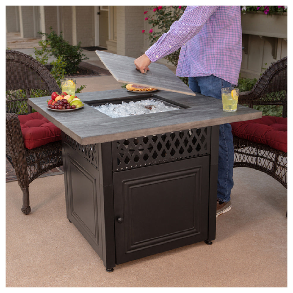 The Chef Master GAD19101ES Donovan® Outdoor Fire Pit is a sophisticated heating solution, measuring 37-4/5" in width and depth, and standing at 30-7/10" in height, designed to enhance outdoor spaces with style and functionality. This square fire pit incorporates the innovative DualHeat™ technology, which provides a total of 41,000 BTU – allocating 30,000 BTU to the upper burner and 11,000 BTU to the lower burner, thus ensuring efficient and customizable heating. It features a faux wood top, adding an elegant and natural aesthetic, complemented by a robust black steel base. The fire pit includes a stainless steel burner, ensuring durability and high performance in various weather conditions. Aesthetic and functional enhancements include bronze fire glass, a hide-away table insert, and a protective cover, which contribute to both its visual appeal and utility. The unit is designed to accommodate a 20 lb. LP gas tank, though not included, enabling extended use. Certified by CSA Star and CSA Flame, it meets rigorous safety and performance standards. The Chef Master GAD19101ES Donovan® Outdoor Fire Pit is a versatile asset for residential or commercial settings, offering energy-efficient heating and an inviting ambiance.