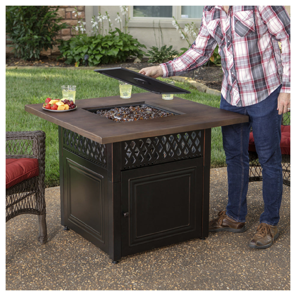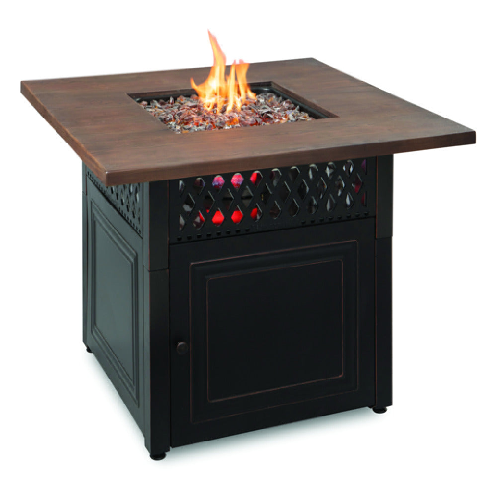 The Chef Master GAD19102ES Dakota® Outdoor Fire Pit is a versatile square unit measuring 37-4/5"W x 37-4/5"D x 30-7/10"H, perfectly suited for enhancing outdoor living spaces. Featuring DualHeat™ technology, it delivers a combined heat output of 41,000 BTU - with 30,000 BTU dedicated to the upper burner and 11,000 BTU for the lower burner - offering efficient warmth for various outdoor settings. Its sophisticated design includes a faux wood top, stainless steel burner, and an oil-rubbed bronze finish on black steel, ensuring durability and aesthetic appeal. The fire pit comes complete with bronze fire glass that adds a touch of elegance to the flames. For added convenience, it includes a hide-away table insert and a protective cover, ensuring it remains a functional and attractive centerpiece in any space. Accommodating a 20 lb. LP gas tank (not included), this fire pit is CSA Star and CSA Flame certified, underscoring its adherence to safety standards. This product stands out in the market for its blend of advanced technology, stylish design, and robust performance, catering to a broad spectrum of users from residential homeowners to commercial hospitality venues seeking to elevate their outdoor ambiance.