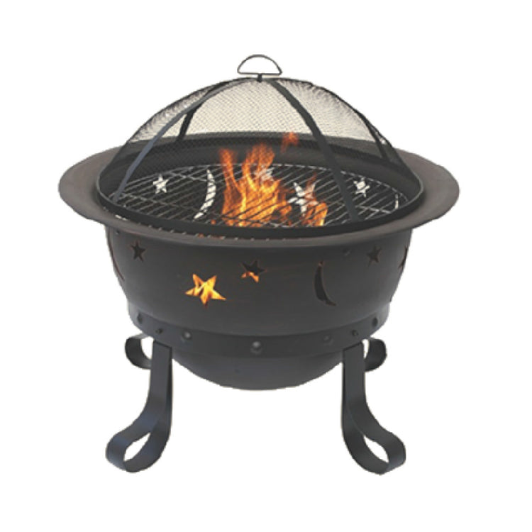 The Chef Master WAD1081SP Blue Rhino® UniFlame® Outdoor Wood Firebowl is an intricately designed fire bowl that seamlessly blends functionality with aesthetic appeal. With dimensions of 29-3/10 inches in diameter and 26-7/10 inches in height, this round firebowl is adorned with charming stars and moon cutouts, adding a whimsical touch to any outdoor setting. The firebowl is constructed from a durable, oil-rubbed steel bowl, ensuring longevity and resilience against the elements. Its bronze finish not only enhances its visual appeal but also provides a layer of protection. The inclusion of a removable lid allows for easy access and maintenance, while the wrought iron stand offers robust support and stability. This firebowl is ideally suited for various market segments, including residential homeowners seeking to enhance their garden or patio space, as well as hospitality businesses aiming to create inviting outdoor environments for guests. The Chef Master WAD1081SP Blue Rhino® UniFlame® Outdoor Wood Firebowl stands out for its unique design elements and sturdy construction, making it a valuable addition to any outdoor entertainment space.