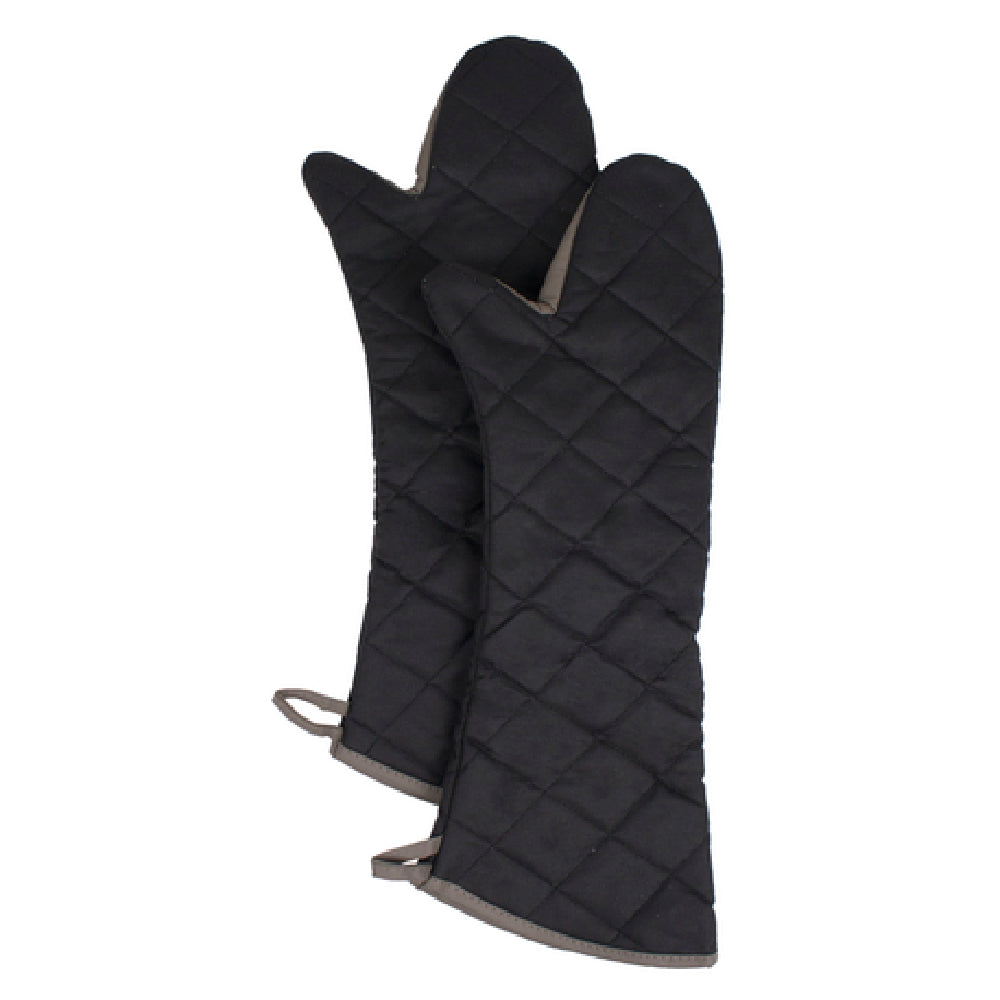 The John Ritzenthaler Company 2PX24ELBKBK-2 Ritz® Pyrotex® Oven Mitt Shoulder Length 24" is a premium kitchen accessory tailored for high-heat environments. This mitt extends up to 24 inches, providing comprehensive arm protection, making it an excellent choice for chefs and culinary professionals. The seamless grip ensures a secure hold on cookware, enhancing safety during use. Constructed using Kevlar® thread, this oven mitt is notable for its durability and resistance to wear and tear. The pull-away lining is another thoughtful feature, allowing for easy removal and maintenance, while also providing an additional layer of safety. Engineered to protect against temperatures up to 450°F, this mitt is flame-resistant, making it a dependable accessory in the intense conditions of a professional kitchen. Its design is completed with a sophisticated black color accented with beige trim, adding a touch of elegance to its functionality. Packed 36 pairs per case, this product is ideal for bulk purchases by restaurants, catering companies, and large institutions needing to equip their kitchens with reliable protective gear. The John Ritzenthaler Company 2PX24ELBKBK-2 Ritz® Pyrotex® Oven Mitt embodies a blend of safety, durability, and style, meeting the diverse needs of food service professionals.