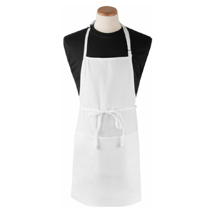 John Ritzenthaler Company 3PBIAELWH Ritz® Bib Apron - 26" x 31" Extra Long is expertly designed for those seeking durability and functionality in culinary environments. This apron boasts three front pockets and an additional pen pocket, providing ample space for essential tools and accessories. Crafted from DuraSure® polyester, it is both fade and water-resistant, ensuring longevity even in demanding kitchen settings. The apron features a seamless bottom design, enhancing its clean lines and providing added strength. Its adjustable neck strap allows for a customizable fit, catering to comfort and practicality for users of varying sizes. Reinforced with bias trim, it underscores the commitment to quality and detailed construction. The apron is presented in a classic white color, exuding professionalism suitable for chefs, bakers, and kitchen staff alike in diverse market segments from commercial kitchens to personal culinary use. Packed by 24 each per case, the John Ritzenthaler Company apron is an efficient choice for bulk purchasing, ideal for businesses looking to equip their staff with reliable apparel. Its thoughtful design and robust fabric make it a versatile and essential addition to any kitchen environment, combining functionality with a touch of elegance.