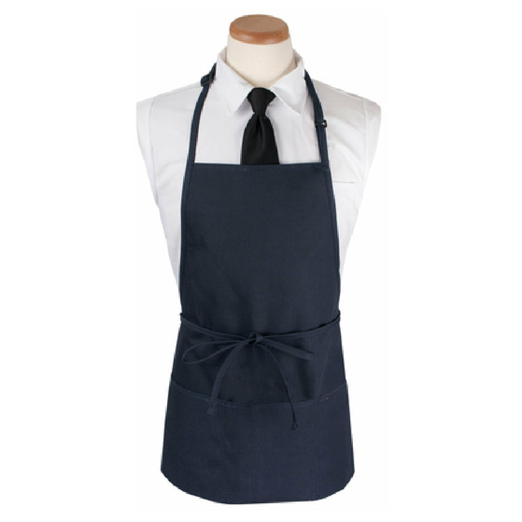 The John Ritzenthaler Company 3PBIANVFP Ritz® Bib Apron is a versatile and durable apron designed for professional use, measuring 26" x 23" long. Its thoughtful construction features three front pockets and a pen pocket, providing ample storage for essential tools and accessories. The apron is crafted from DuraSure® polyester, known for its fade and water-resistant properties, making it suitable for the demanding environments of kitchens and restaurants. Additionally, it is equipped with a seamless bottom to ensure longevity and easy maintenance. An adjustable ring neck strap allows for a customizable fit, enhancing comfort during extended wear. The reinforced bias trim adds an extra layer of durability, ensuring that the apron withstands regular use. Available in a classic navy blue color, this apron is packed by 24 each per case, making it an excellent choice for bulk purchases by culinary schools, catering companies, and large restaurant operations. The John Ritzenthaler Company 3PBIANVFP Ritz® Bib Apron combines functionality and resilience, catering to the varied needs of chefs and culinary professionals across different market segments within the food service industry.
