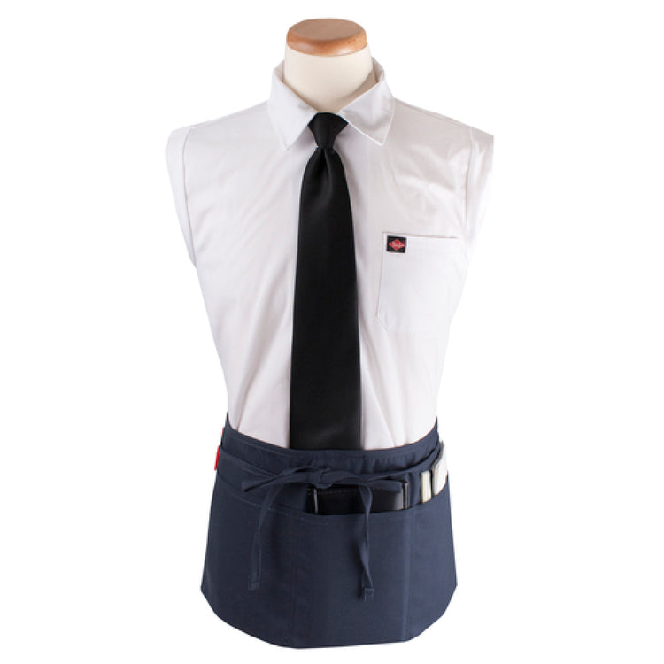 The John Ritzenthaler Company CL3PWACNV Ritz® Chef's Line® Waist Apron is an essential piece for professionals in culinary settings, measuring 25 inches by 11 inches long. It features a practical design with three pockets and an additional pen pocket, catering to the needs of chefs and kitchen staff who require easily accessible storage for their tools and utensils. Constructed from DuraSure® polyester, this apron is both fade and water-resistant, ensuring longevity and durability even in demanding kitchen environments. The printed navy blue design adds a touch of sophistication and professionalism, making it suitable for a variety of culinary establishments. Each apron is retail packaged and is available in cases packed by 12, providing convenience for bulk purchases. The apron’s robust construction and functional design make it an ideal choice for restaurant kitchens, culinary schools, and catering services, offering reliable performance and practicality for daily use.