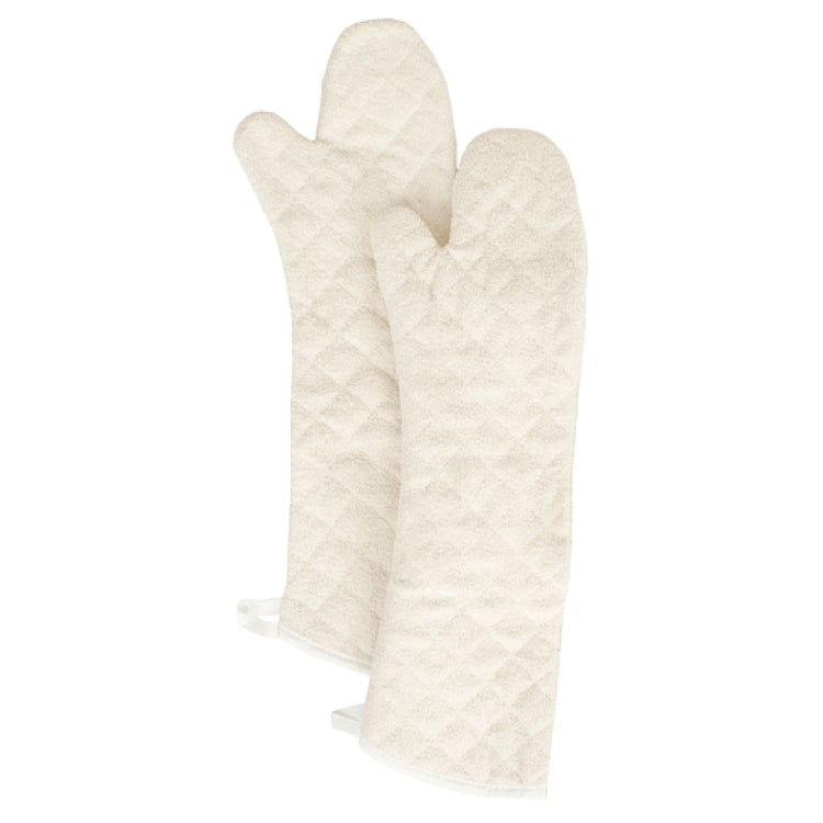 The John Ritzenthaler Company CLTTOM24BE-1 Ritz® Chef's Line® Oven Mitt Shoulder Length 24" is a premium safety accessory designed for kitchens where high-temperature handling is essential. This oven mitt is distinguished by its substantial shoulder-length design, measuring 24 inches, providing comprehensive coverage and protection for professional chefs and home cooks alike. It is engineered to withstand temperatures of up to 450°F, ensuring safety during intense cooking sessions. The mitt features a silicone lining, which enhances heat resistance and offers an additional layer of protection against burns. Constructed from 100% terry cloth, it combines durability with a soft, comfortable feel, making it suitable for extended use in commercial and domestic environments. The beige color adds a touch of classic style, while its machine washable nature ensures easy maintenance and hygiene. This oven mitt is particularly valuable in environments such as professional kitchens, baking industries, and catering services, where safety and reliability are paramount. Its blend of extensive protection, high-temperature tolerance, and easy care make it a versatile and essential tool for various culinary applications, catering to the needs of diverse market segments within the food service industry.