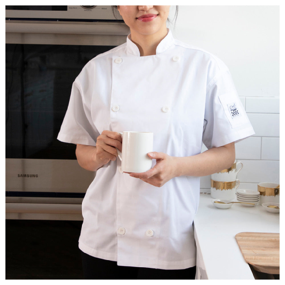 The John Ritzenthaler Company J005-S Chef Revival® Chef's Jacket is an expertly designed garment tailored for culinary professionals seeking functionality and comfort. Characterized by its short sleeve and drop shoulder design, this chef's jacket ensures ease of movement and a relaxed fit, making it an ideal choice for bustling kitchen environments. The inclusion of a pen/thermometer pocket adds a layer of practicality, providing chefs with a convenient storage solution for essential tools. Constructed from a durable poly/cotton blend, this jacket balances breathability and resilience, making it suitable for long hours in the kitchen. The classic white color offers a timeless aesthetic while the back yoke enhances the jacket's structural integrity and fit. The Knife & Steel® branding further emphasizes the jacket's commitment to quality and durability, appealing to professional chefs who prioritize reliability in their work attire. Suitable for chefs in restaurant, catering, and hospitality sectors, the John Ritzenthaler Company J005-S Chef Revival® Chef's Jacket combines technical craftsmanship with thoughtful design features to meet the diverse needs of culinary experts, ensuring both comfort and convenience in high-pressure culinary settings.